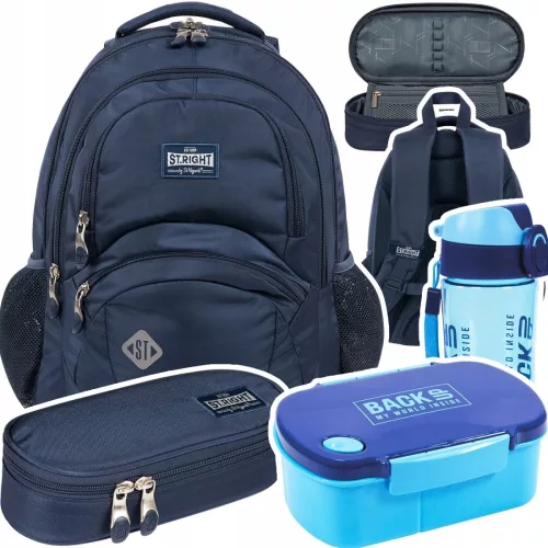 Zestaw zawiera: plecak szkolny, piórnik saszetkę, bidon oraz śniadaniówkę.