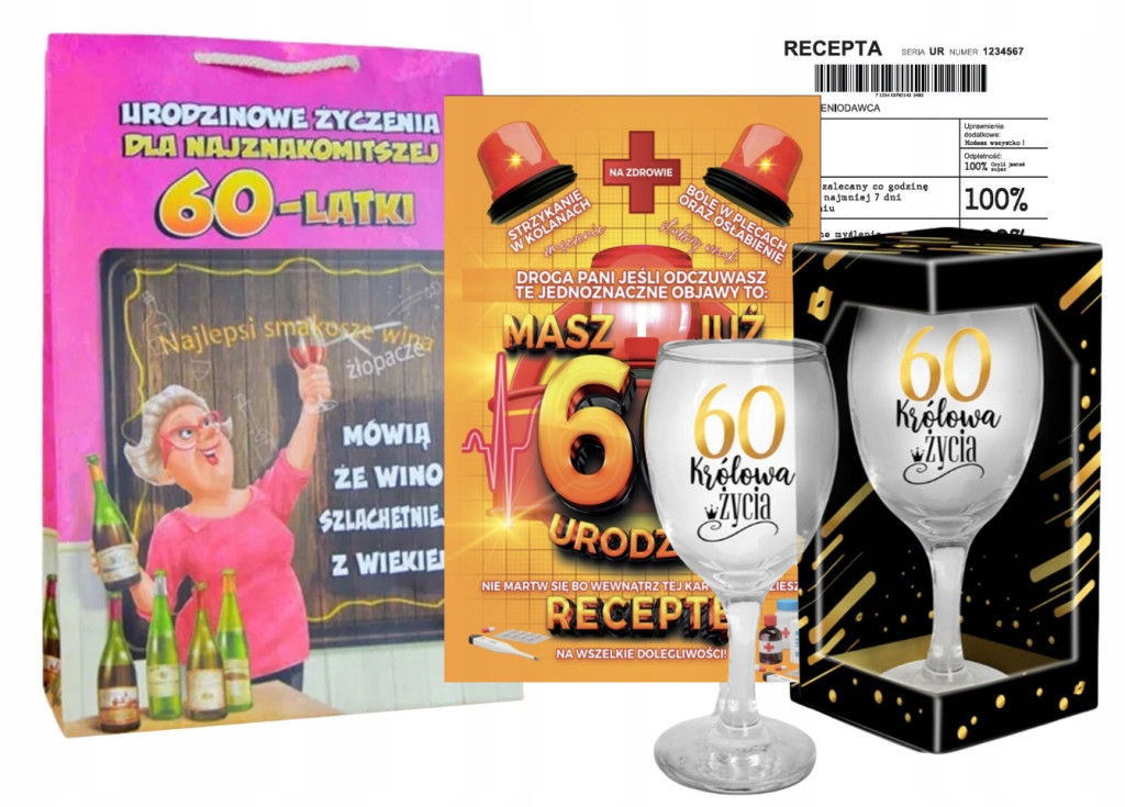 W zestawie znajduje się śmieszna torebka prezentowa, kieliszek do wina z nadrukiem " 60 Królowa Życia" kartka z życzeniami, recepta urodzinowa oraz koperta