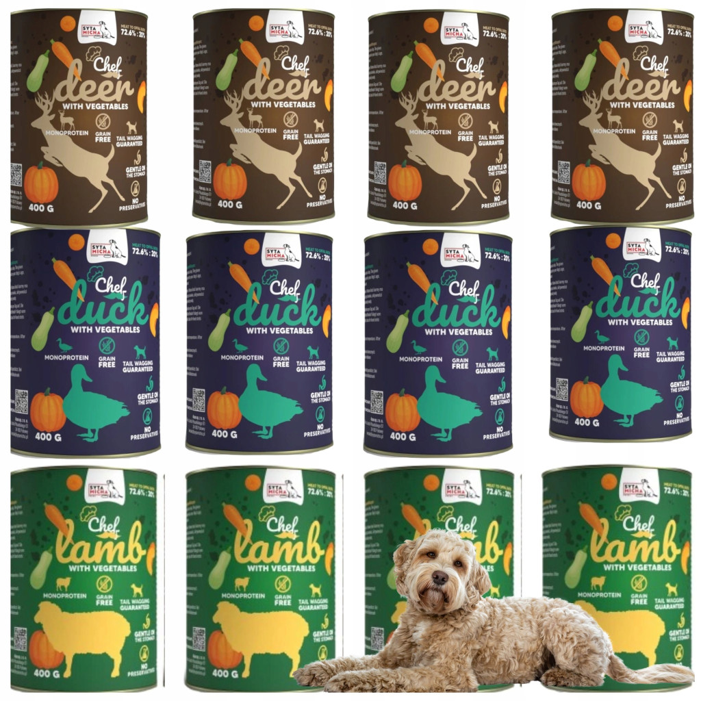 SYTA MICHA CHEF KARMY 400g to wyjątkowa karma mokra stworzona z myślą o zdrowiu i smaku Twojego psa. Oparta na monoproteinowej formule, zapewnia lekkostrawne i dietetyczne pożywienie o wysokiej smakowitości. Skomponowana przez specjalistę ds. żywienia psów, ta karma jest idealnym rozwiązaniem dla psów dorosłych, zwłaszcza tych z wrażliwym żołądkiem, alergiami pokarmowymi, nadwagą lub dla seniorów.