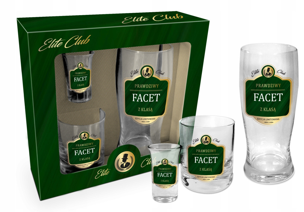 Niezbędnik faceta 3w1 wykonany z najwyższej jakości przezroczystego szkła zdobiony zielono-złotą grafiką. Na każdym elemencie zestawu nadrukowany jest napis 'Prawdziwy facet z klasą'.