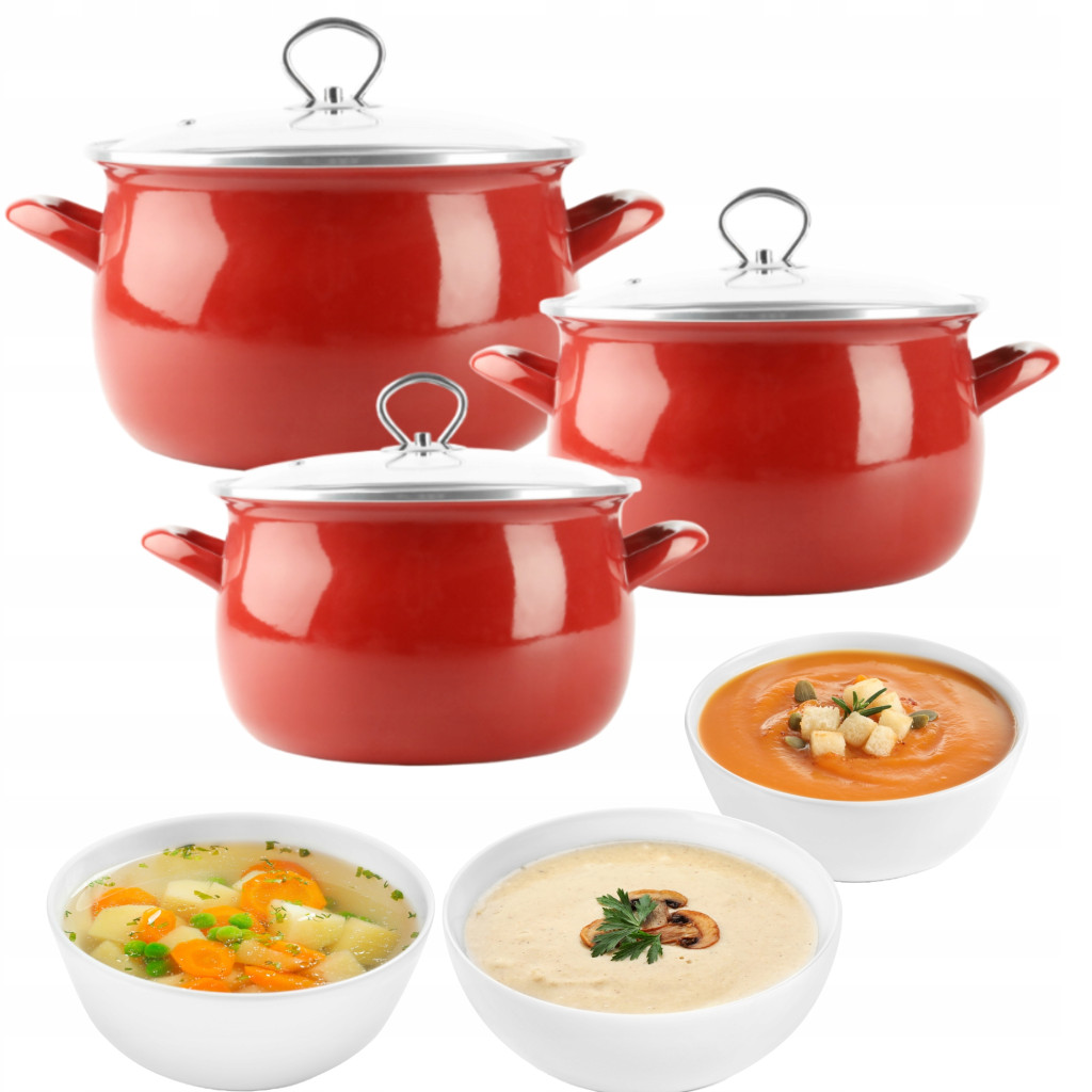 Zestaw garnków emaliowanych HELENA o o pojemności 3, 4 i 5,5 litrów w kolorze czerwonym jest niezbędnym elementem każdej kuchni. Garnki to kluczowe naczynia do przygotowywania różnorodnych, smacznych i zdrowych posiłków, idealne dla pasjonatów gotowania, jak i okazjonalnych kucharzy.