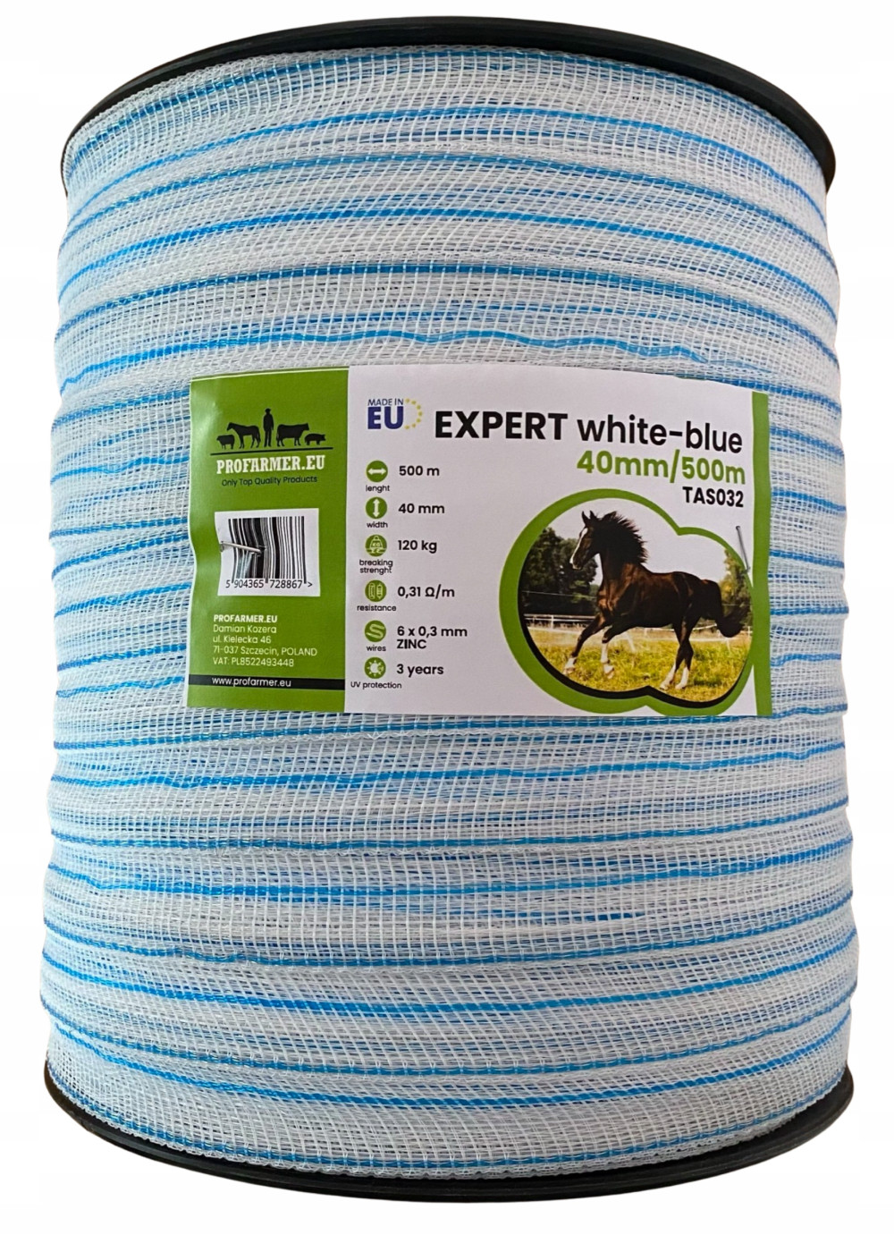 Nasza TAŚMA PREMIUM w przeciwieństwie do innych biało niebieskich taśm charakteryzuje się gęstym splotem i nie jest taśmą półprzezroczystą, dla zwiększenia widoczności posiada aż 3 niebieskie paski. Wybierając naszą TAŚMĘ EXPERT stawiacie Państwo na jakość i nasze ponad 40 letnie doświadczenie w budowie elektrycznych ogrodzeń.