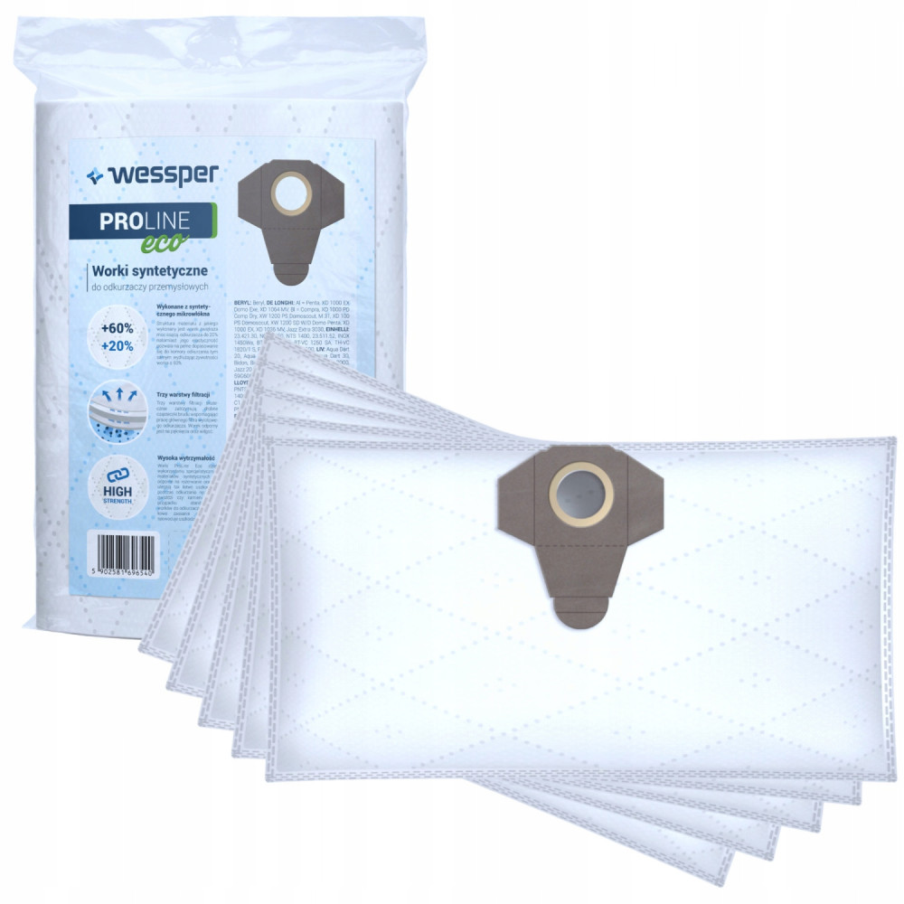 Worki ProLine Eco dzięki wykorzystaniu specjalistycznych materiałów syntetycznych są odporne na rozerwanie oraz nie ulegają tak łatwo uszkodzeniu podczas odkurzania np.: szkła, gwoździ czy kamieni jak w przypadku standardowych worków do odkurzaczy. Przypad-kowe zassanie cieczy nie spowoduje uszkodzenia worka.