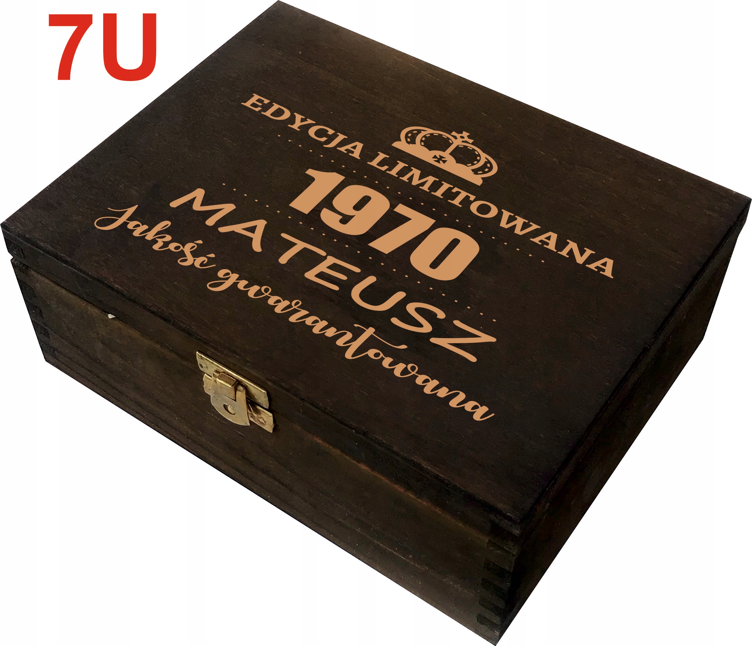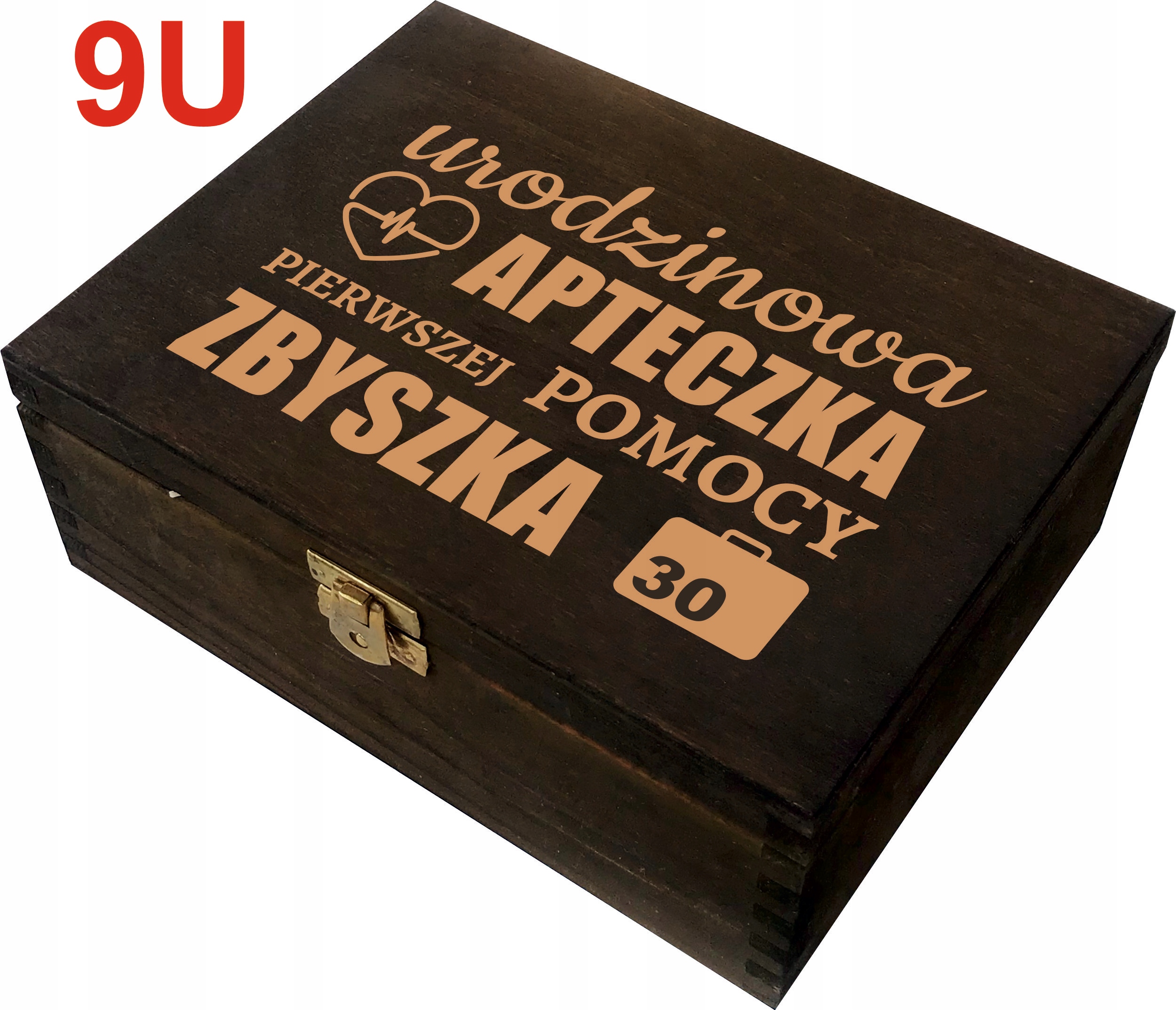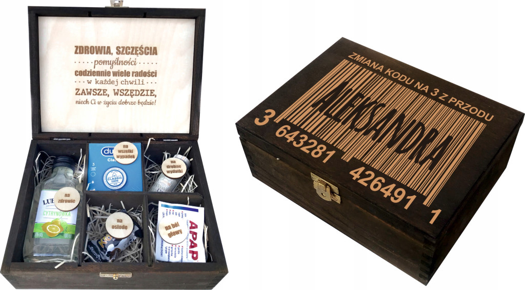 Grawer na wieczku pudełka jest indywidualnie dopasowywany do zamówienia. Oznacza to, że z w zależności od motywu, wygrawerujemy na nim podane przez Ciebie imię, rok urodzenia lub wiek osoby obdarowywanej. Przykładowo w motywie 9U możemy wygrawerować "URODZINOWA APTECZKA PIERWSZEJ POMOCY KASI" oraz odpowiednią liczbę np. 45.