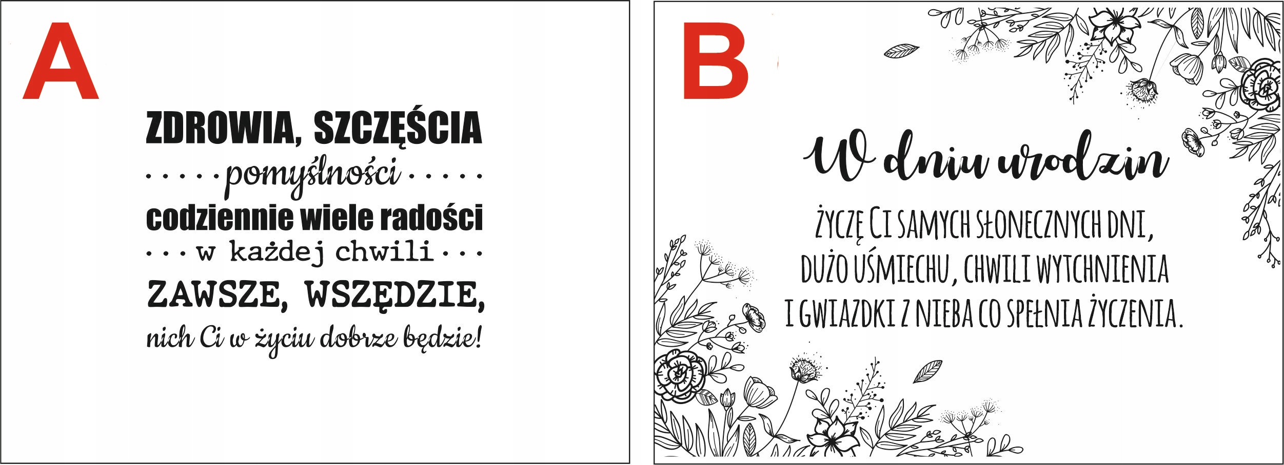 W przypadku braku powyższych informacji, wysyłamy życzenia A, kółeczka: na zdrowie, na wszelki wypadek, na drobne wydatki, na osłodę, na ból głowy, oraz grawer na wieczku 9U z napisem URODZINOWA APTECZKA PIERWSZEJ POMOCY (bez imienia i wieku).