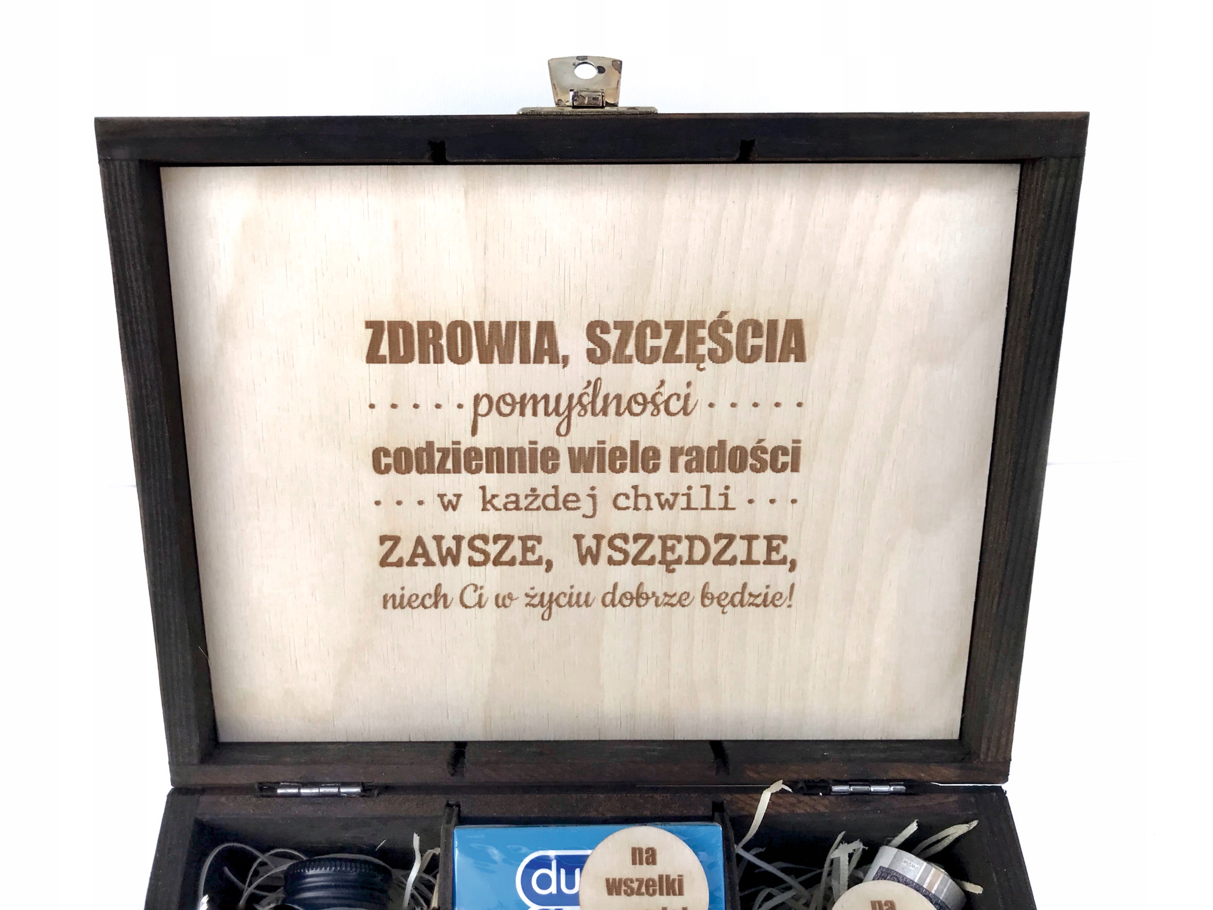 Kupując u nas na aukcji dostajesz niezbędnik z grawerem na wieczku oraz w środku, 5 szt. drewnianych grawerowanych kółeczek oraz wełnę drzewną.