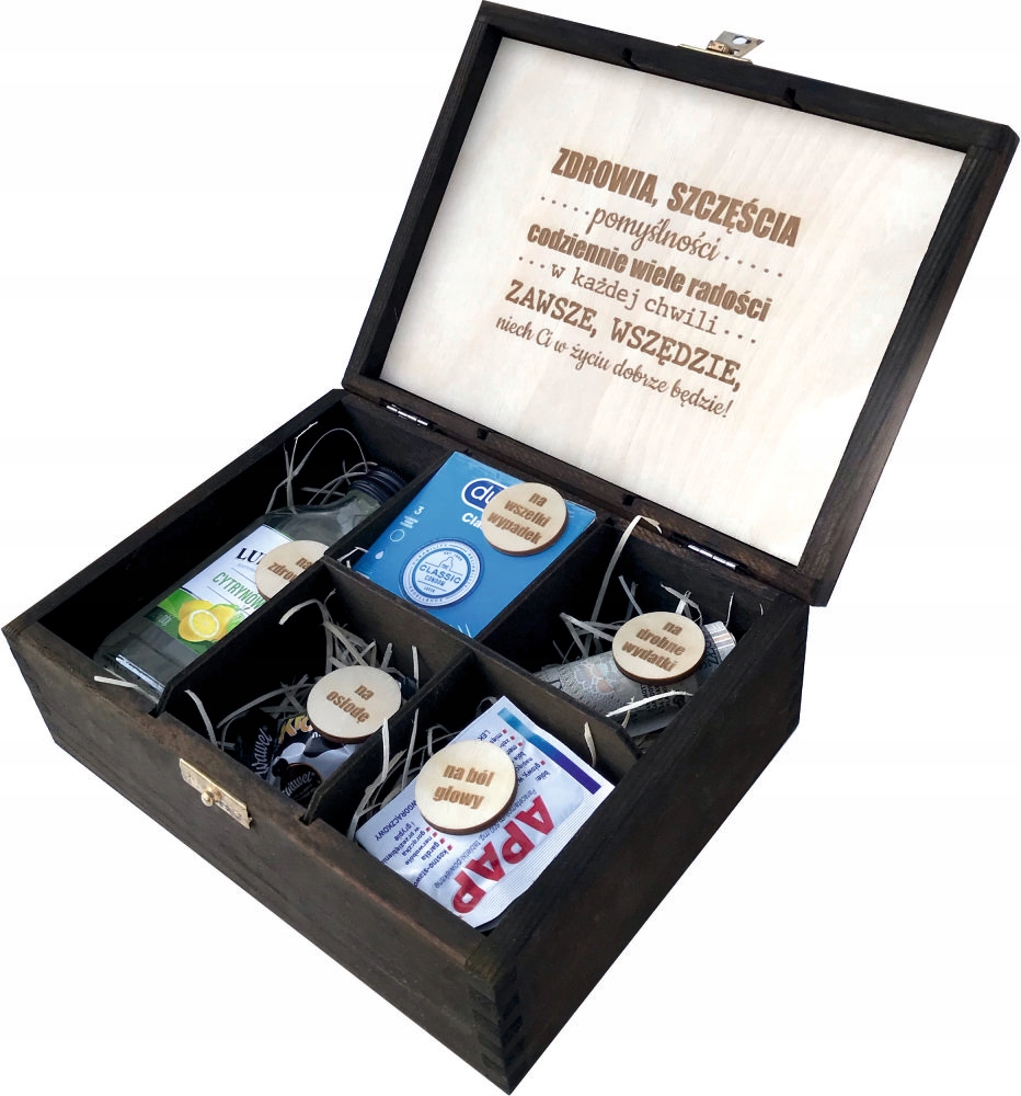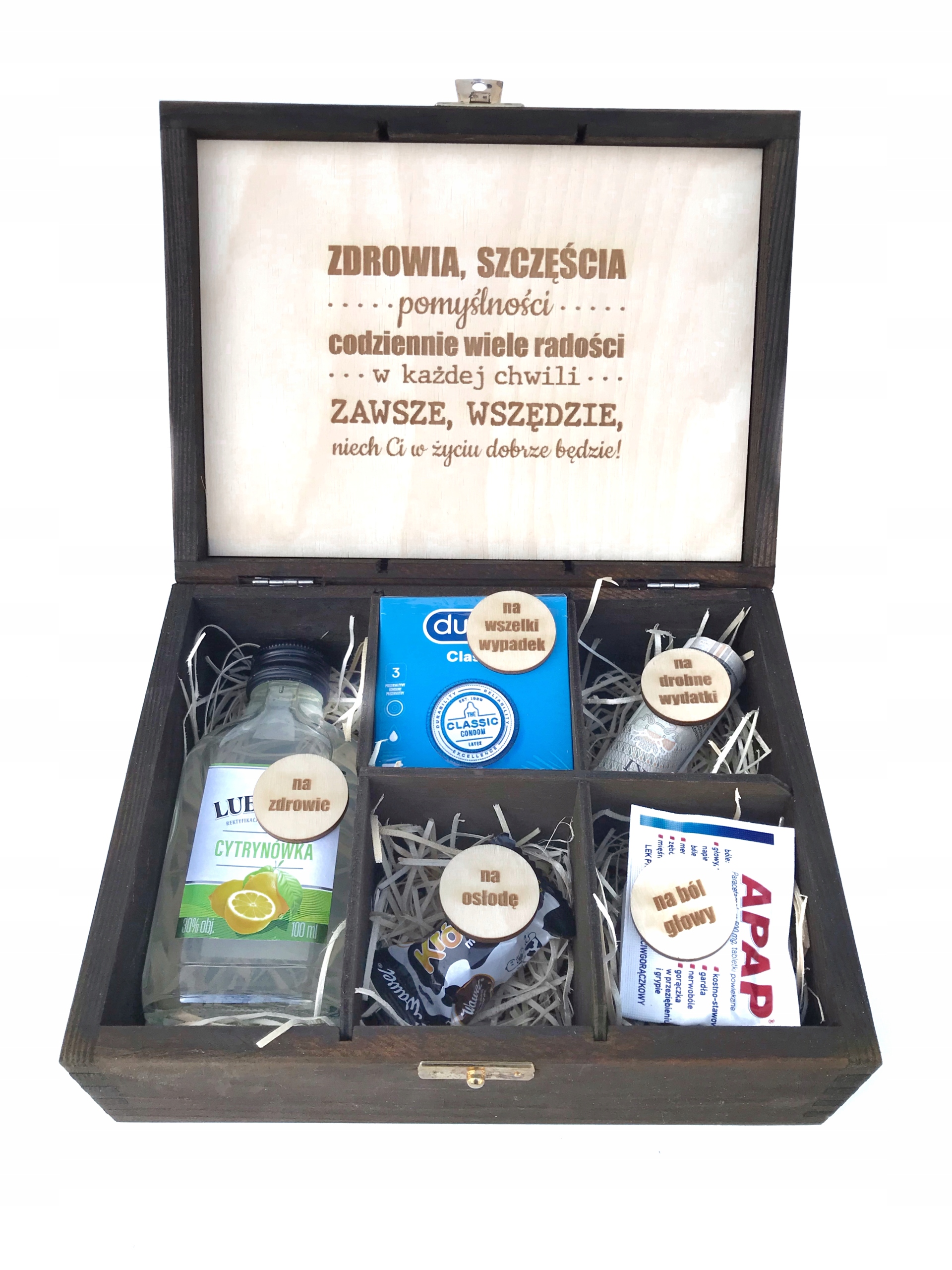 Pudełko stanowi oryginalny prezent z okazji 18, 30, 40, 50.... urodzin. Taki prezent z pewnością wywoła uśmiech osoby obdarowywanej oraz zostanie w jej pamięci na długo.