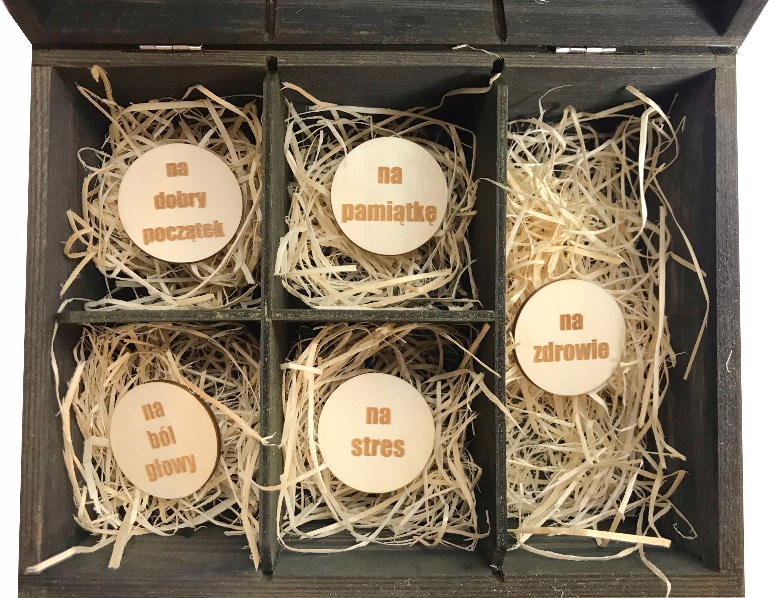 W środku pudełka znajduje się grawerowana drewniana tabliczka z życzeniami.