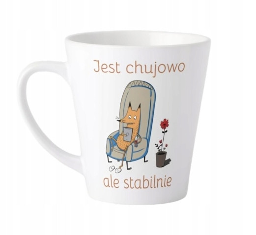 Ta aukcja dotyczy personalizowanego kubka latte z nadrukiem "Jest c**jowo ale stabilnie". Kubek wyróżnia oryginalna delikatna grafika artystyczna.