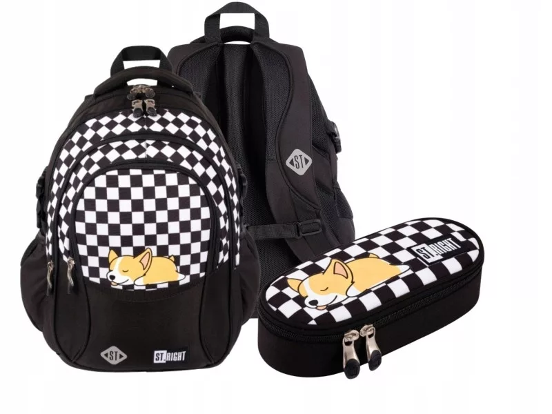 Śliczny zestaw szkolny (plecak, piórnik - sztywna saszetka) w klasyczną czarno-białą kratę z motywem pieska Corgi.
