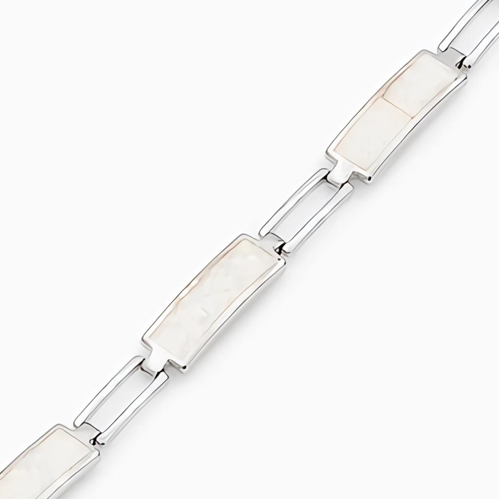 Srebrna bransoletka, jasny opal, długie prostokąty z przerwami, rozmiar elementu ozdobnego : długość około 2 cm, szerokość około 0,5 cm.