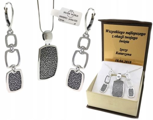Komplet biżuterii na każdą okazję! Elegancki i gustowny, wykonany ze srebra o próbie 925 z należytą starannością i dbałością o każdy detal. Połączenie ażurowych elementów otoczonych gładkim i połyskującym srebrem to połączenie, które wykorzystać można zarówno w codziennej stylizacji, jak i podczas firmowego spotkania. Biżuteria to doskonały pomysł na prezent! Do kompletu dołączono opakowanie z grawerem.