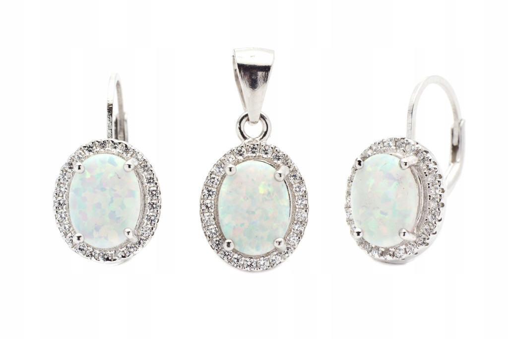 PIĘKNY SREBRNY KOMPLET Z CYRKONIAMI I OPALEM MARKIZA