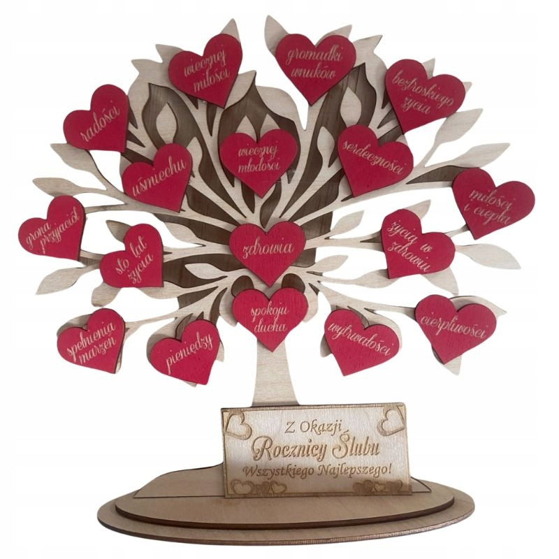 ▶ STOJĄCE DRZEWKO (kolor - jasny naturalny) na podstawce w którego koronie mamy wklejone CZERWONE SERDUSZKA ze słowami podziękowania