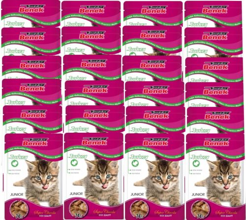 Saszetka Super Benek Junior Turkey to starannie wyselekcjonowane mięsne kęski z dodatkiem jagnięciny zanurzone w aromatycznym sosie, które dostarczające kociakom białka i innych niezbędnych składników koniecznych do wzrostu i energicznych zabaw. Gwarantuje to zbilansowaną dietę, mogącą sprostać specjalnym wymaganiom dorastających kotów.