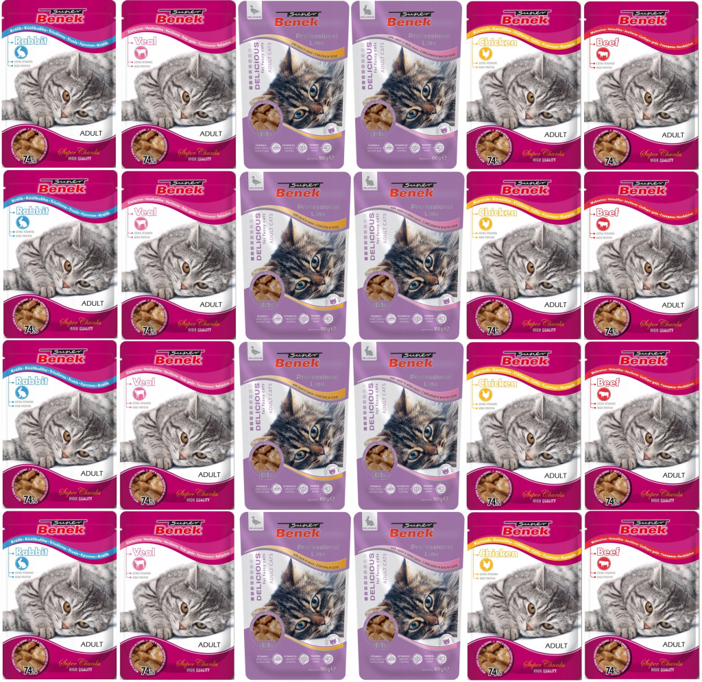 Skład: Mięso oraz produkty pochodzenia zwierzęcego (wieprzowina; drób; 4% królika; wołowina) 81% w kawałkach, roślinne ekstrakty białkowe, zboża, minerały, ryby i produkty pochodne z ryb, produkty pochodzenia roślinnego (celuloza), różne cukry.