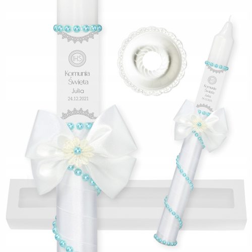 to świeca stylizowana białą satyną oraz niebieskimi perełkami. Maryjny kolor aplikacji sprawia, że świeca dedykowana jest chłopcom, jednak w niektórych regionach Polski również dziewczynkom.