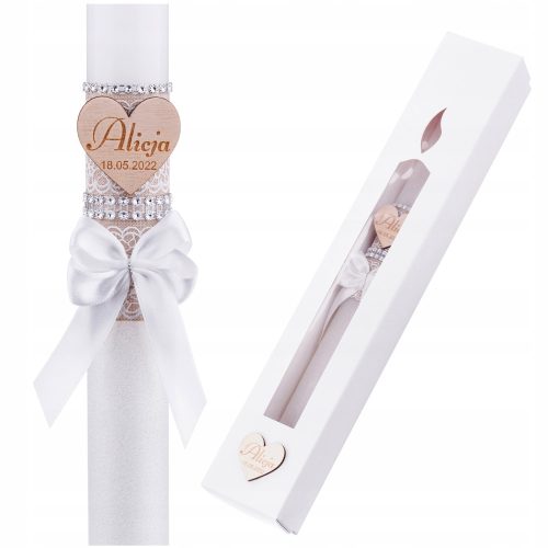 Świeca pakowana jest w pudełko o eleganckim kształcie. Podobnie do świecy, na pudełku również znajduję się drewniane serduszko do kompletu na którym możemy wygrawerować imię dziecka oraz datę uroczystości.