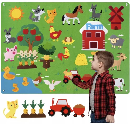 ✅ Wielofunkcyjność: Tablica posiada różnorodne filcowe elementy, które dziecko własnoręcznie układa, tworząc swoje unikalne sceny z życia na farmie.