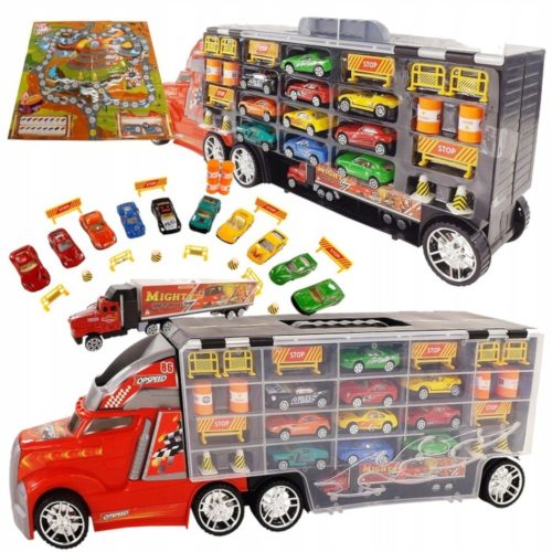 Ciężarówka i akcesoria drogowe w osobnych komorach, natomiast z drugiej strony jest miejsce na kolejne resorówki i akcesoria dla prawdziwych kolekcjonerów oraz kostka do gry i plansza do gry wyścigowej!