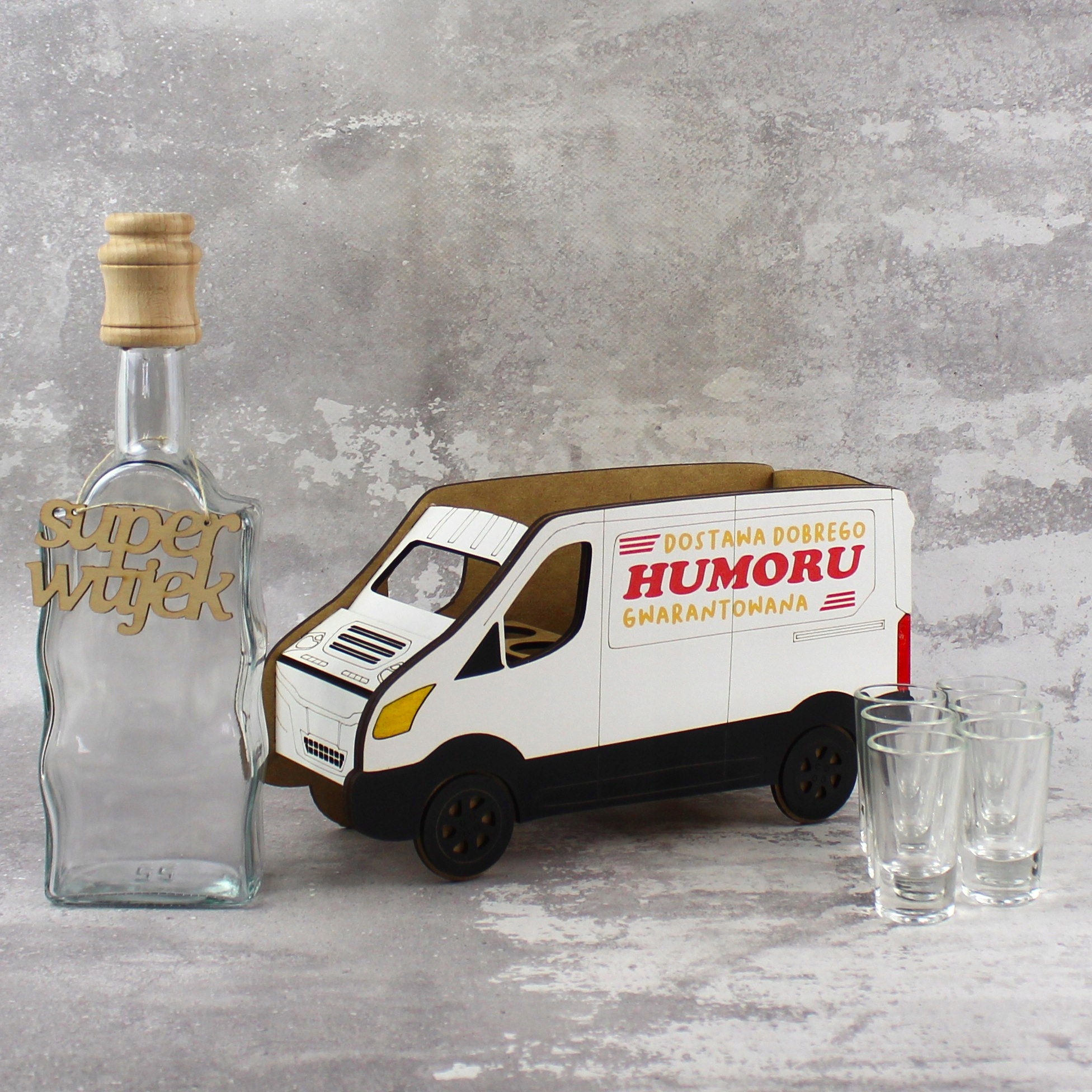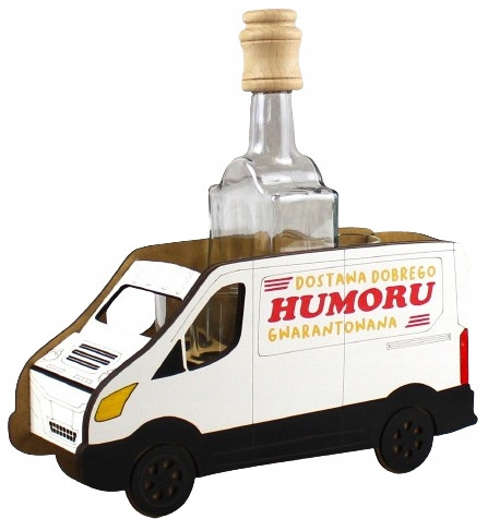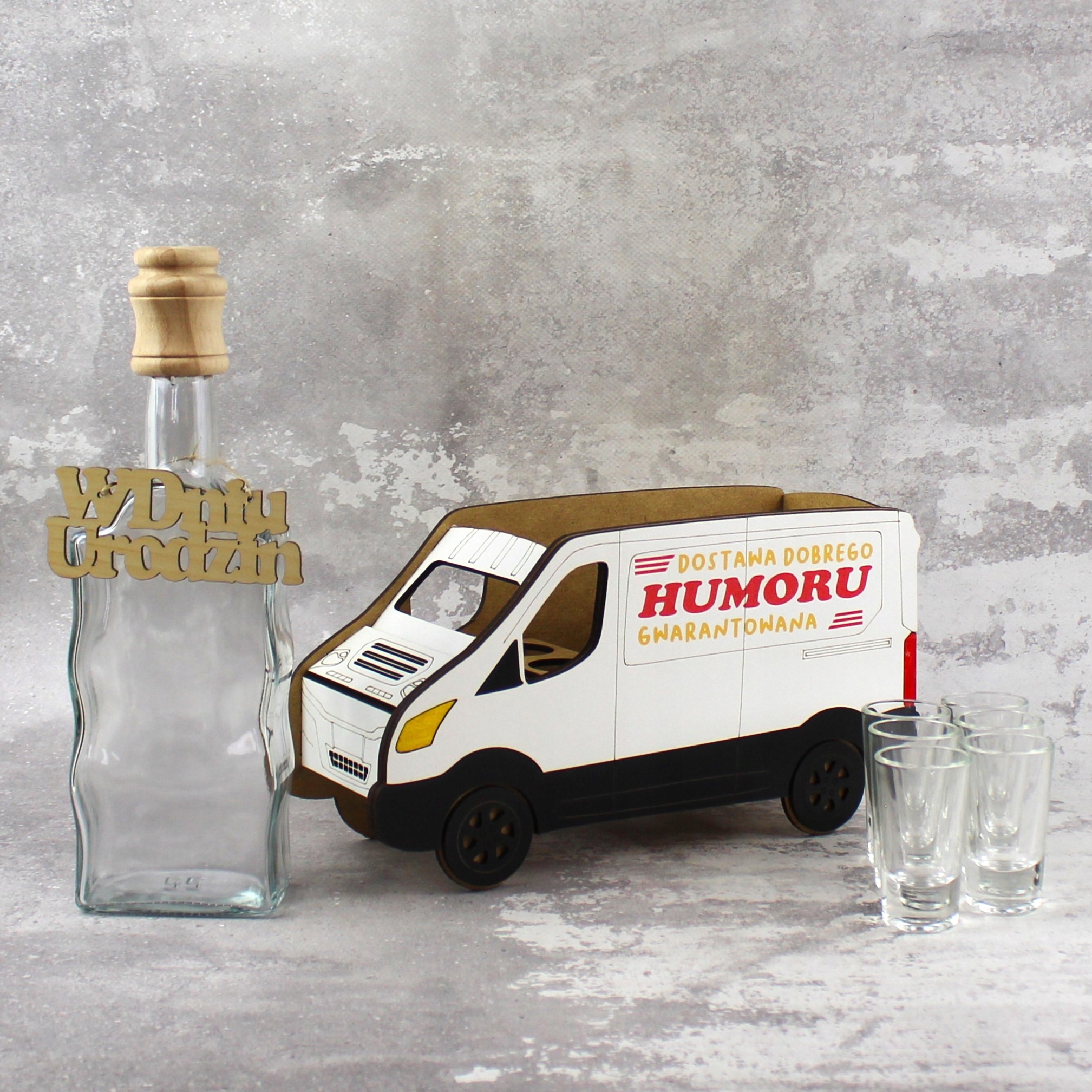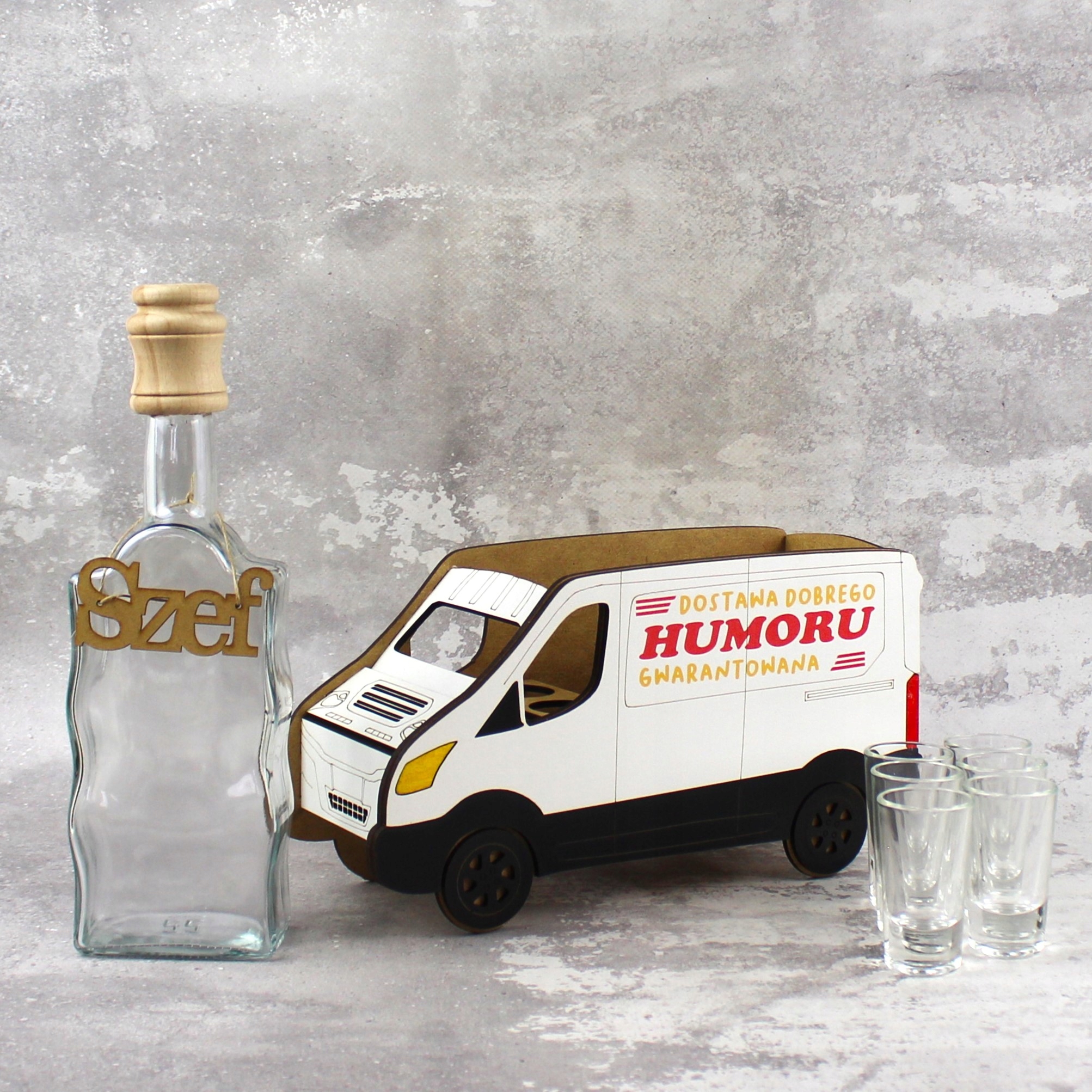 Polecamy fantastyczny zestaw - karafka na alkohol z kompletem kieliszków do wódki, umieszczone na wyjątkowej podstawie w kształcie samochodu dostawczego z grawerem.