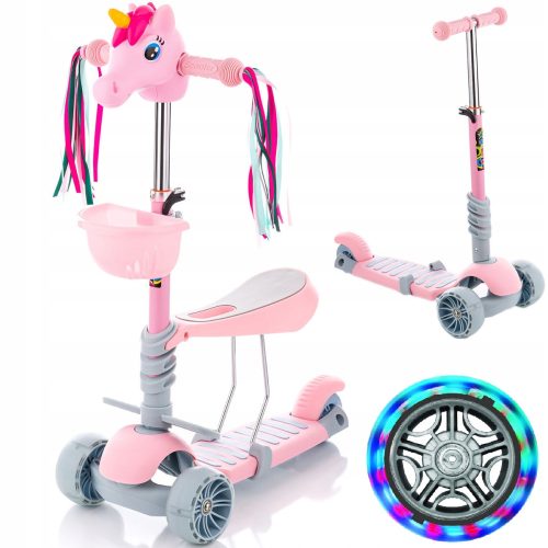 Głowa jednorożca dodaje uroku i wyróżnia naszą hulajnogę spośród innych, trudno przejść obok niej obojętnie. Kolorowe wstążki powabnie powiewają w trakcie jazdy, koszyczek z przodu pomieści najcenniejsze skarby w trakcie letnich spacerów.