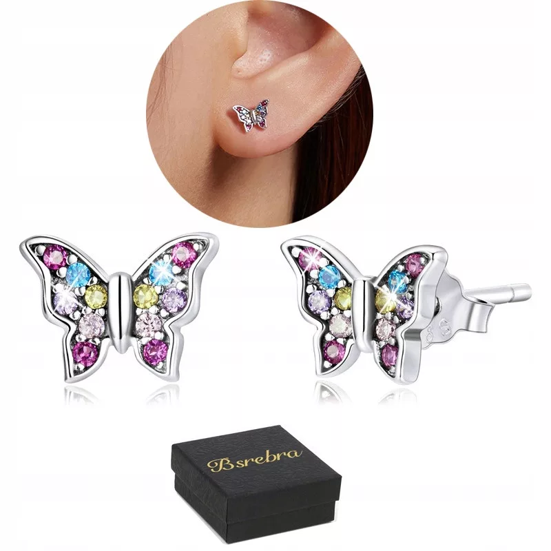 KOLCZYKI Srebrne PRÓBA 925 Motyle z Cyrkoniami SREBRO Sztyfty WKRĘTKI Damskie