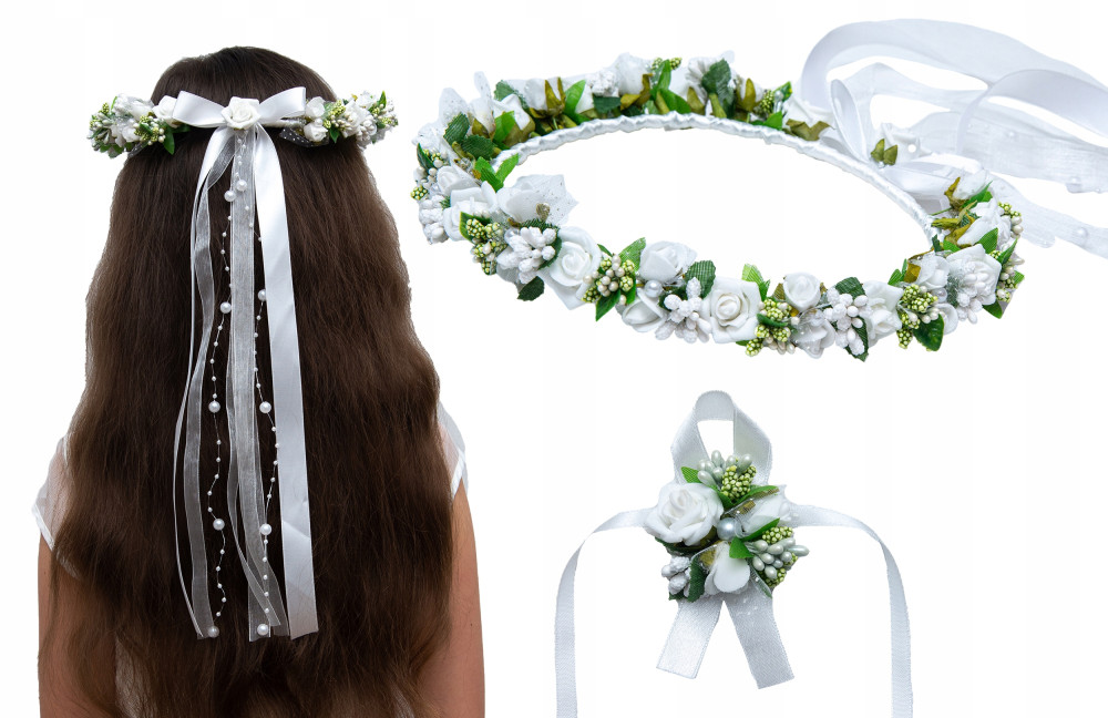 Realistyczny wygląd kwiatów, dodatków oraz wykończenie atłasową kokardą nadają delikatnego i eleganckiego wyglądu dziewczynce w tym ważnym dniu.