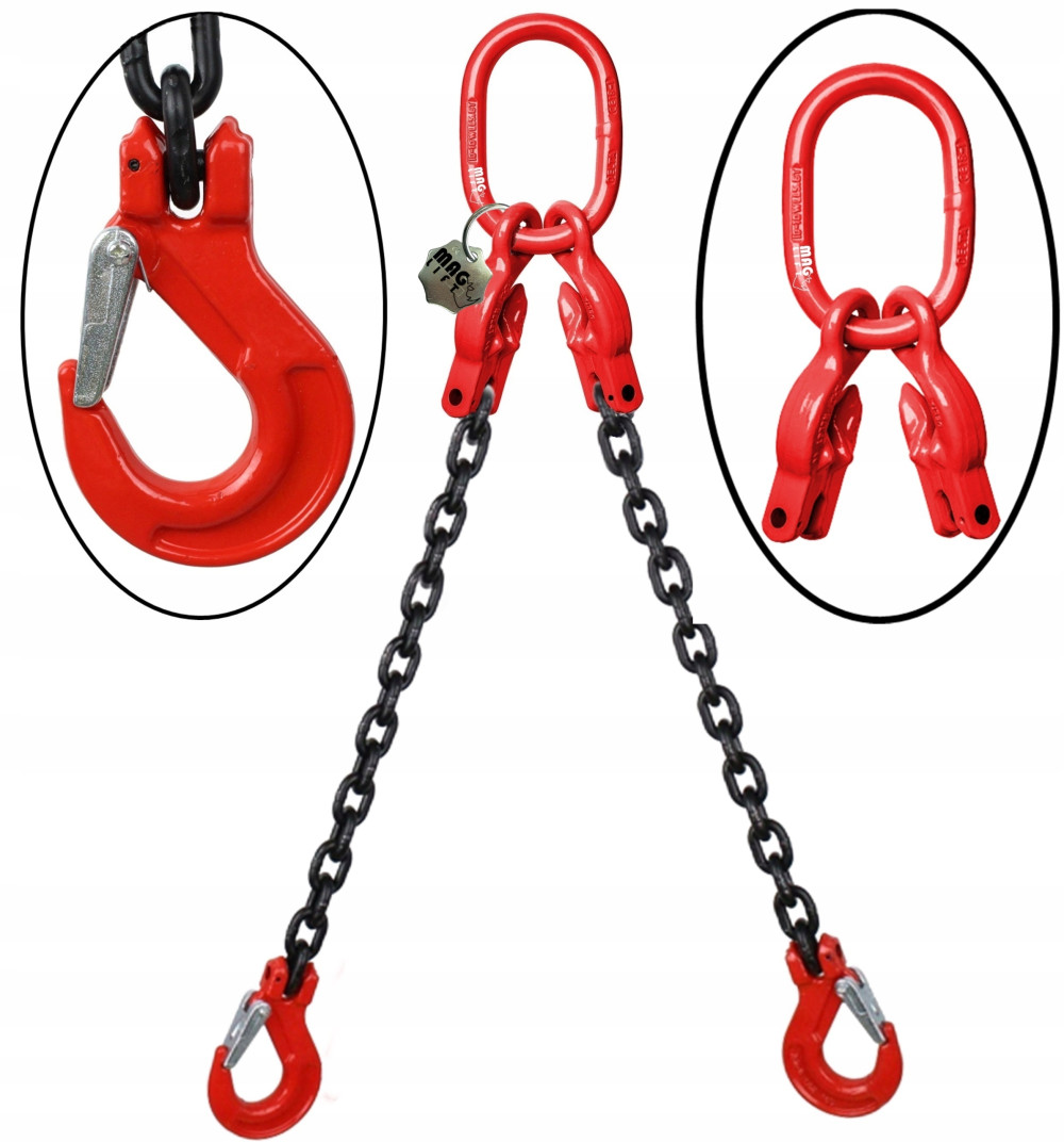 WYKONANIE: zawiesie łańcuchowe 2-cięgnowe wyprodukowanie wg PN-EN 818-4 z atestowanych komponentów i łańcucha zawiesiowego o wytrzymałości na rozciąganie 800 N/mm2 / GR8 / i spełniające wymagania Dyrektywy Maszynowej 2006/42/WE wyd. maj 2006.