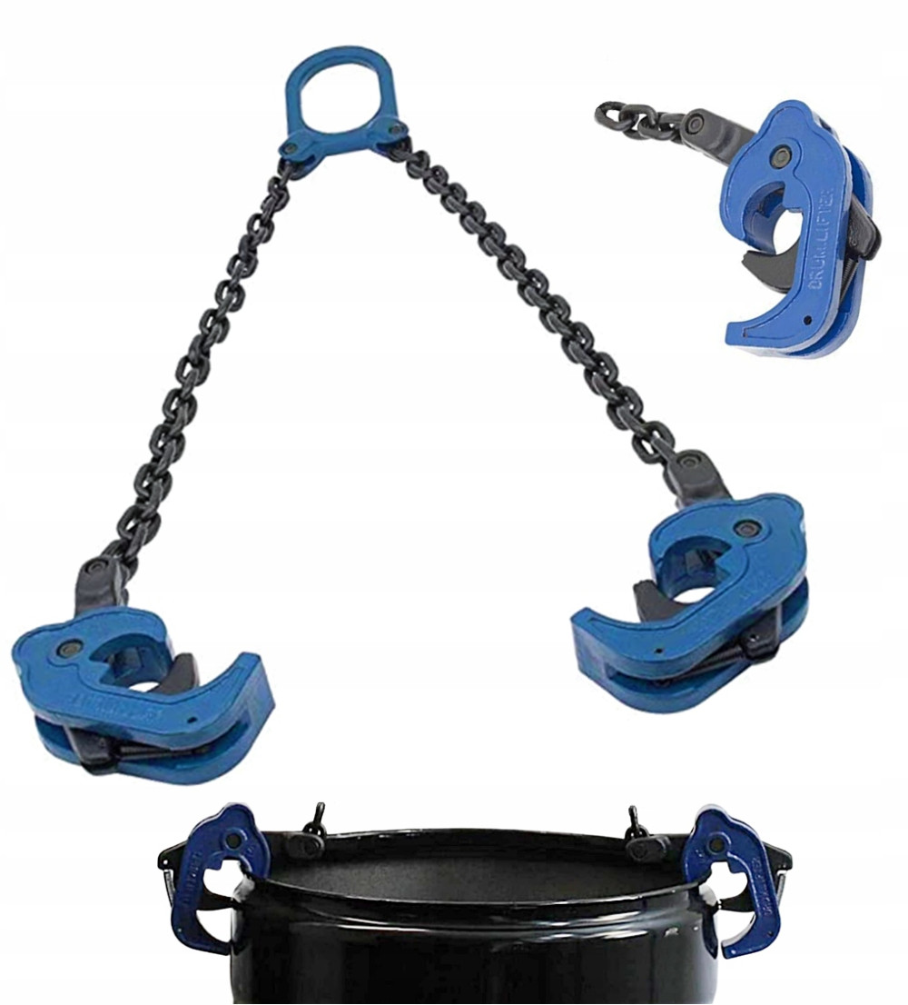 ZASTOSOWANIE: Zawiesie do beczek z chwytakami jest idealne do podnoszenia beczek za pomocą suwnicy, wózka widłowego, dźwigu lub innego wciągnika. Może być używany do podnoszenia, obracania lub przechylania stalowych beczek do 1000 kg.