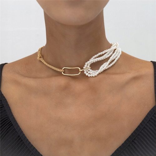 Nietuzinkowy naszyjnik typu "pół na pół". Łańcuszek z supłem oraz perełki. Oba elementy łączone geometryczną wstawką.