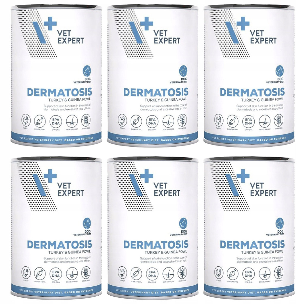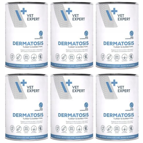 VET EXPERT DERMATOSIS DOG TURKEY & GUINEA FOWL to pełnoporcjowa, kompletna i zbilansowana mokra karma weterynaryjna dla psów dorosłych zmagających się z dermatozą i nadmiernym wypadaniem sierści. Receptura karmy oparta jest na białku zwierzęcym wysokiej jakości (indyk i perliczka).