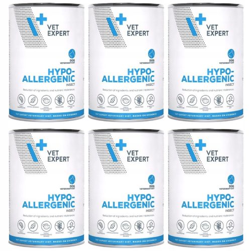 VET EXPERT HYPOALLERGENIC INSECT to dietetyczna, kompletna i zbilansowana mokra karma weterynaryjna dla psów dorosłych. Jej podawanie pomaga w obniżeniu nietolerancji składników i substancji odżywczych. Receptura karmy jest oparta na jednym białku zwierzęcym (z larw owadów Hermetia illucens), co minimalizuje ryzyko wystąpienia alergii.