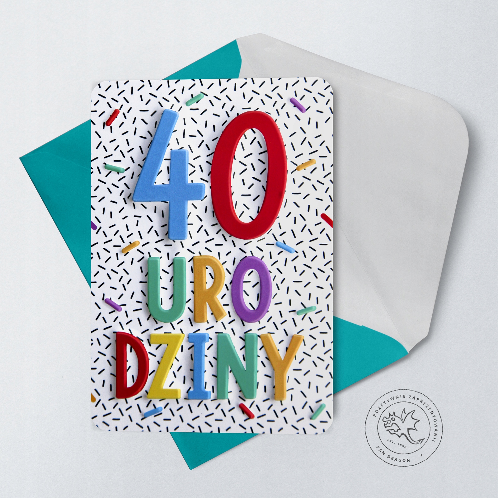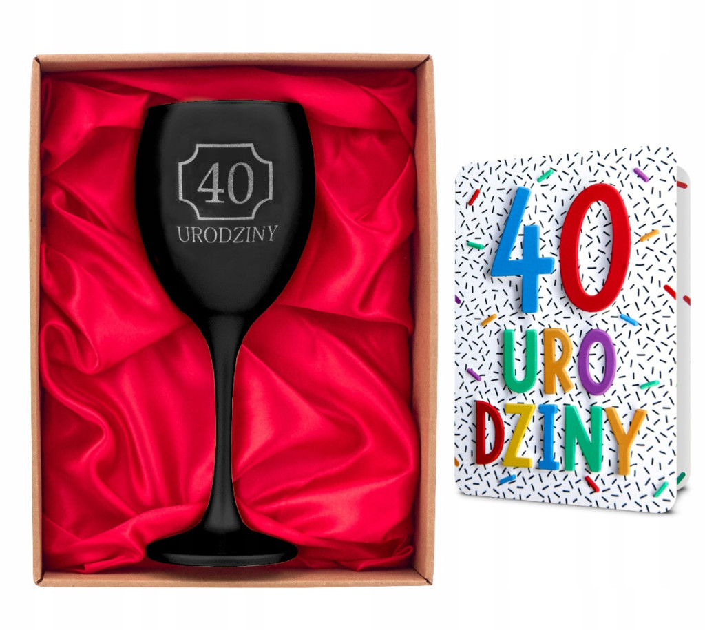 Elegancki kieliszek do wina w kolorze czarnym, udekorowany delikatnym grawerem „40 Urodziny”. Doskonały prezent na wyjątkową okazję. Zapakowany w kartonowe pudełko z wizjerem, wypełnione satyną w kolorze czerwonym. Idealny sposób na celebrowanie tego wyjątkowego momentu w życiu. Kartka jest bogato i różnorodnie zdobiona (lakier perłowy, elementy 3D - wypukłe wstawki papierowe, tłoczenia). Kartka zawiera życzenia i kolorowy środek.