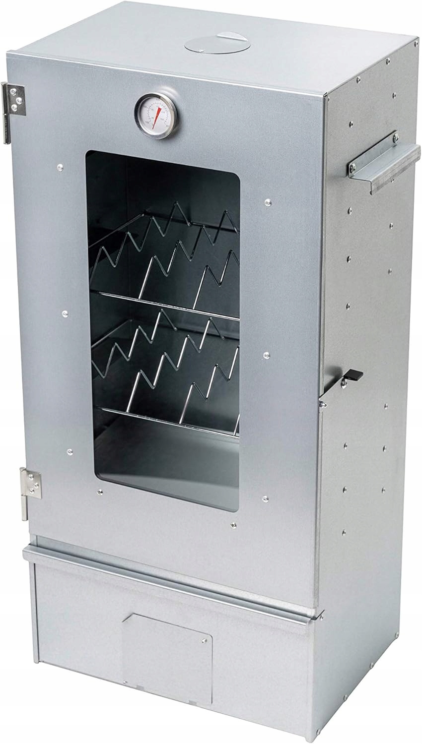 Wędzarnia ma wymiary 80 x 28 x 40 cm, (wys. x szer. x gł.) 2 x chromowany ruszt, 12 x hak wędzarniczy na ryby i kiełbaski, 1 x termometr, 1 x tacka do ociekania (zbierania kapiącego tłuszczu), 1 x miska na trociny.