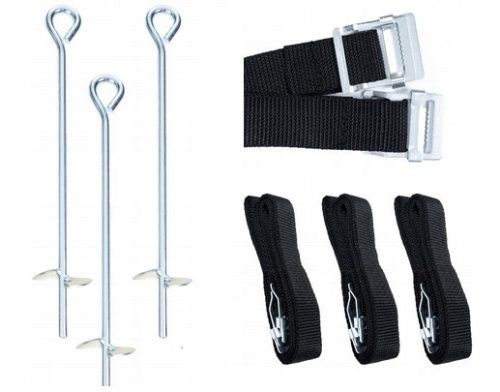 Komplet uniwersalnych kotew zabezpieczających do trampolin ogrodowych wszystkich marek. To niezbędne akcesoria podczas silnych wiatrów. Prosty montaż, dobrej jakość materiały oraz estetyczne wykonanie to zalety naszego produktu.