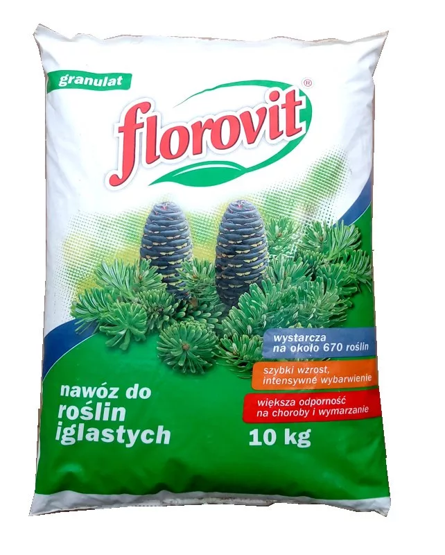 Florovit do roślin iglastych zawiera składniki mineralne w ilościach odpowiadających zapotrzebowaniu ozdobnych roślin iglastych takich jak