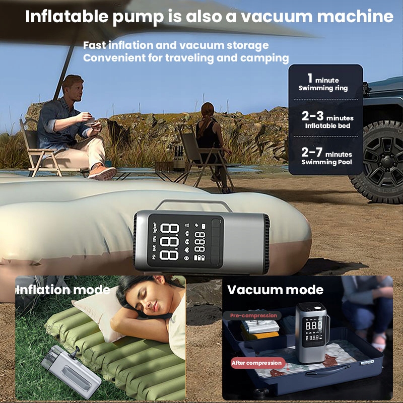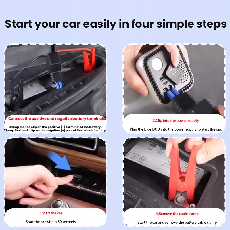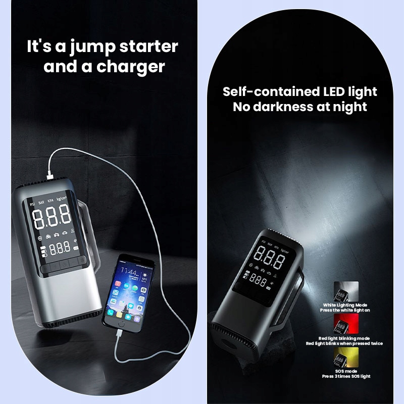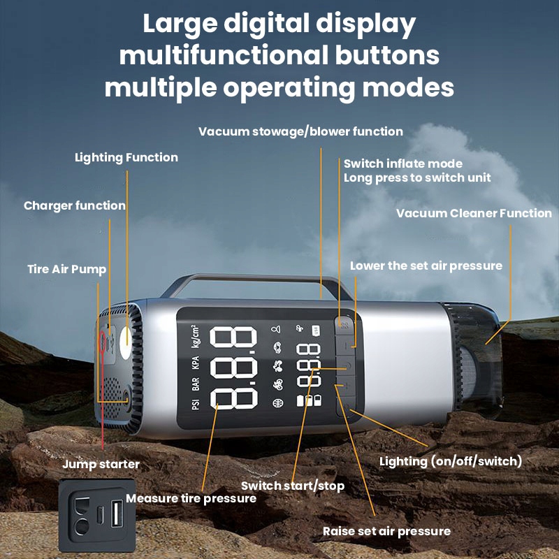 Wielofunkcyjny samochodowy zasilacz awaryjny obejmujący rozrusznik, odkurzacz, pompkę do pompowania, manometr do opon, dmuchawę powietrza, odkurzacz, power bank, latarkę LED i lampkę sygnalizacyjną SOS Beacon Light w jednym kompaktowym urządzeniu. To potężne urządzenie „dziewięć w jednym” zostało zaprojektowane tak, aby być niezawodnym towarzyszem w różnych sytuacjach, co czyni go niezbędnym narzędziem zarówno dla właścicieli samochodów, jak i podróżników. Niezależnie od tego, czy chcesz uruchomić pojazd, napompować oponę, sprawdzić ciśnienie w oponach, napompować materace, naładować urządzenia elektroniczne, rozświetlić ciemność, wezwać pomoc, czy też utrzymać samochód w czystości, to wielofunkcyjne urządzenie Ci pomoże . Jest to najlepsze rozwiązanie, które zaspokoi Twoje awaryjne potrzeby w samochodzie, zapewniając wygodę i spokój ducha, gdziekolwiek zaprowadzi Cię droga.