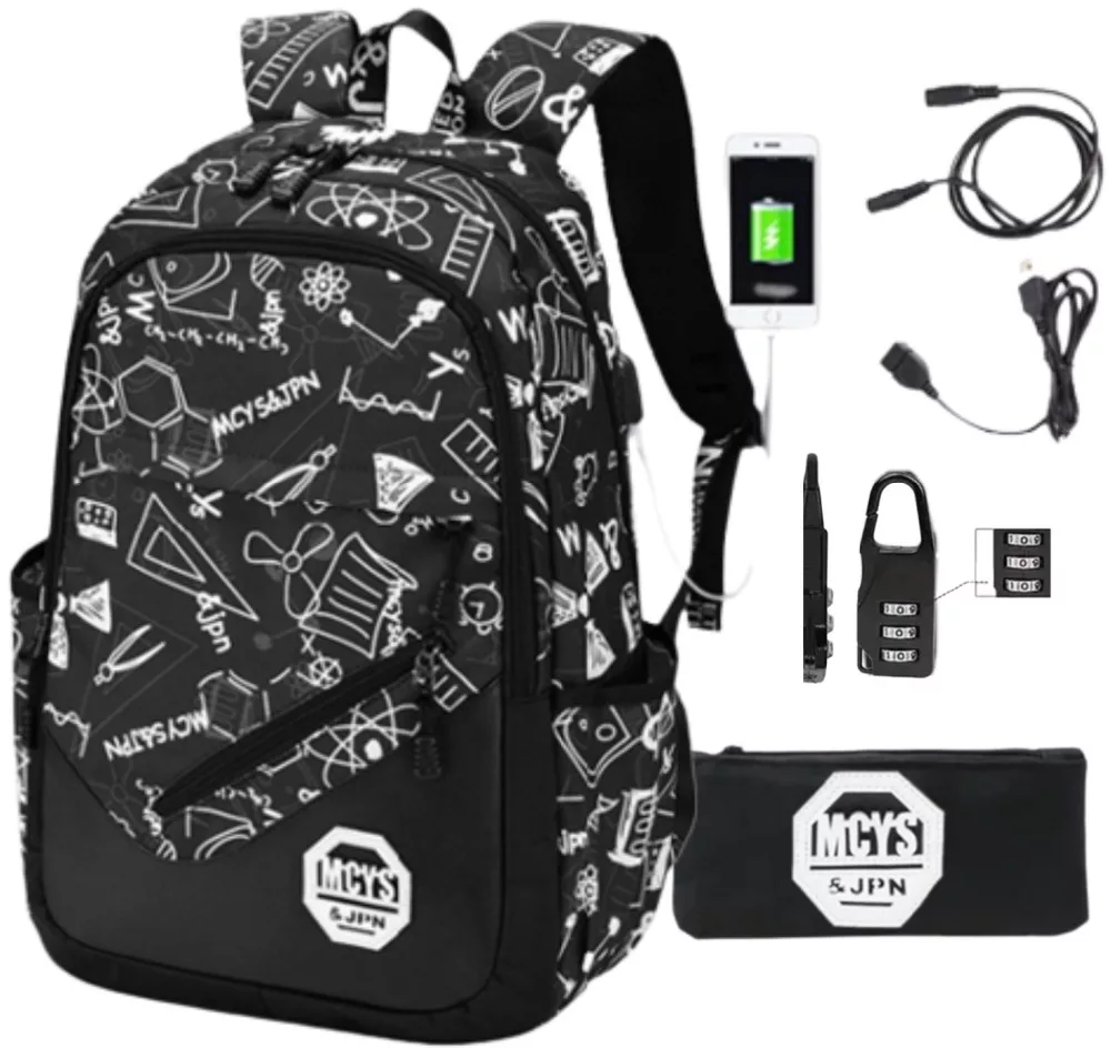 PLECAK SZKOLNY + PIÓRNIK + KŁÓDKA + KABEL USB + KABEL JACK