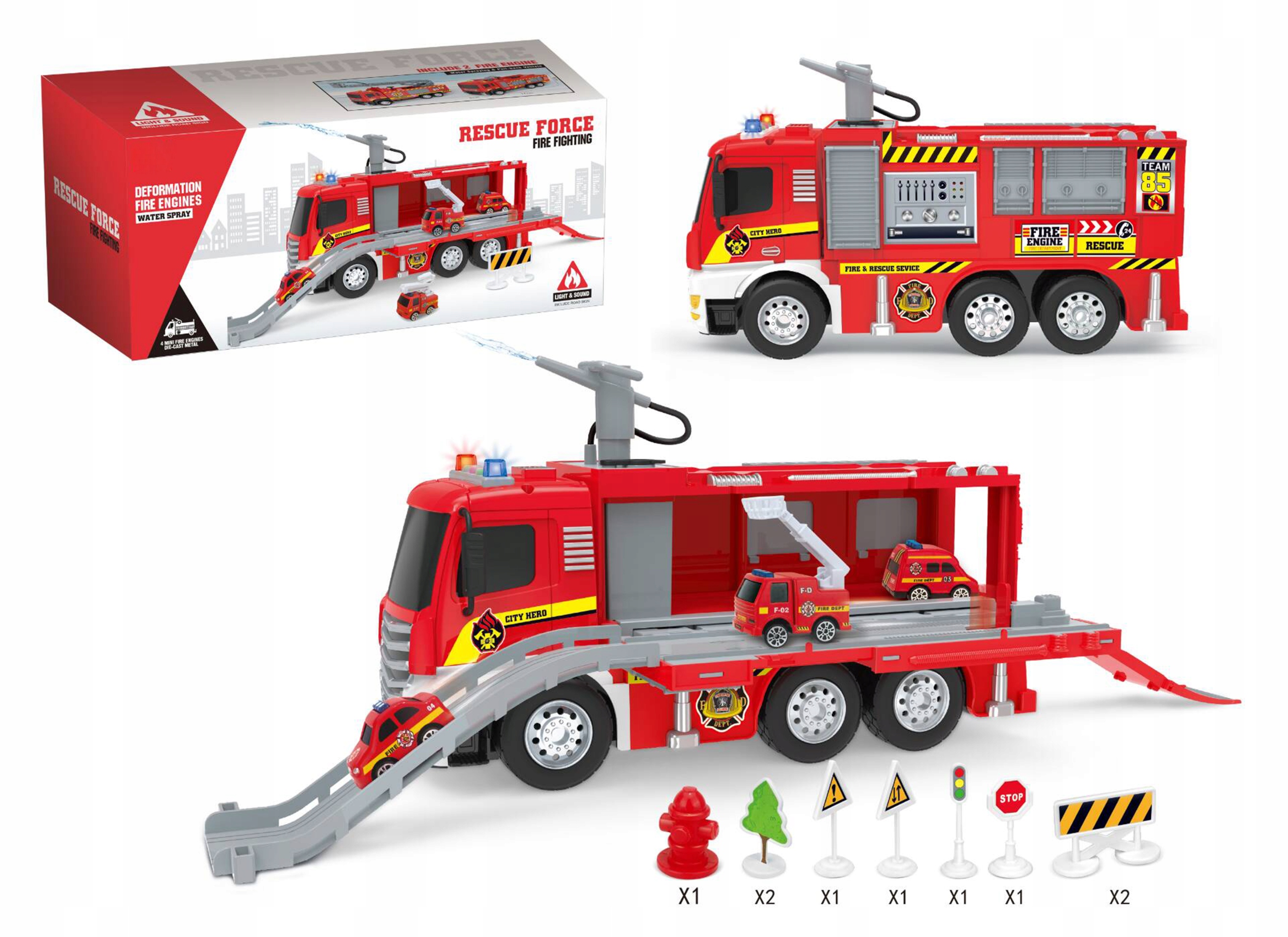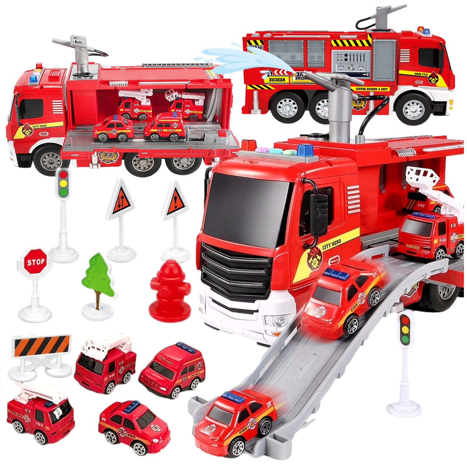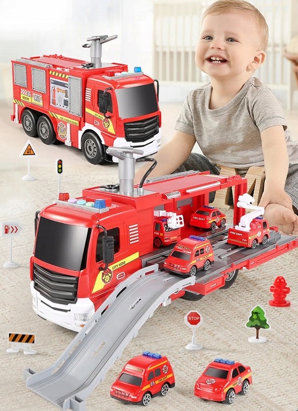 Samochód jest doskonały do zabawy w strażaka gaszącego pożary, w zestawie wszystkie potrzebne akcesoria i 4 dodatkowe pojazdy ratownicze.