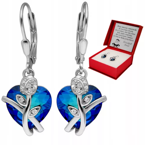 Wyjątkowe kolczyki wykonane z najwyższej jakości srebra próby 925 pokrytego rodem, wysadzanego diamentowymi cyrkoniami, oraz niebieskim sercem