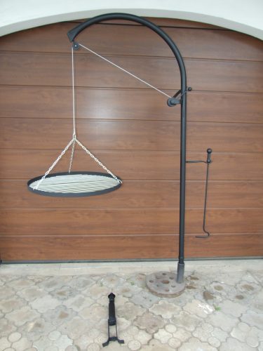 Grill ogrodowy na wysięgniku z regulacją wysokości rusztu oraz możliwością obracania.