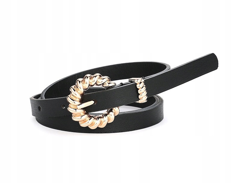 Eleganten ženski pas z ozdobno zlato zaponko v črni barvi, ki bo popolno dopolnil vašo garderobo. Ta ozek pas je idealen za kombiniranje s hlačami ali oblekami ter bo nedvomno popestril vsak outfit. Celotna dolžina pasu je približno 105 cm +/- 2 cm, širina pa 1,4 cm. Izdelan je iz lahko teksturirane eko usnje in neslečenega kovinskega materiala. Zlata barva okraskov dodaja eleganco in privlačnost. Pas je univerzalne velikosti, kar omogoča prilagajanje številnim postavam. Ne glede na priložnost bo ta pas poudaril vašo eleganco in stil. Pričarajte si popoln videz z dodatkom tega čudovitega pasu!