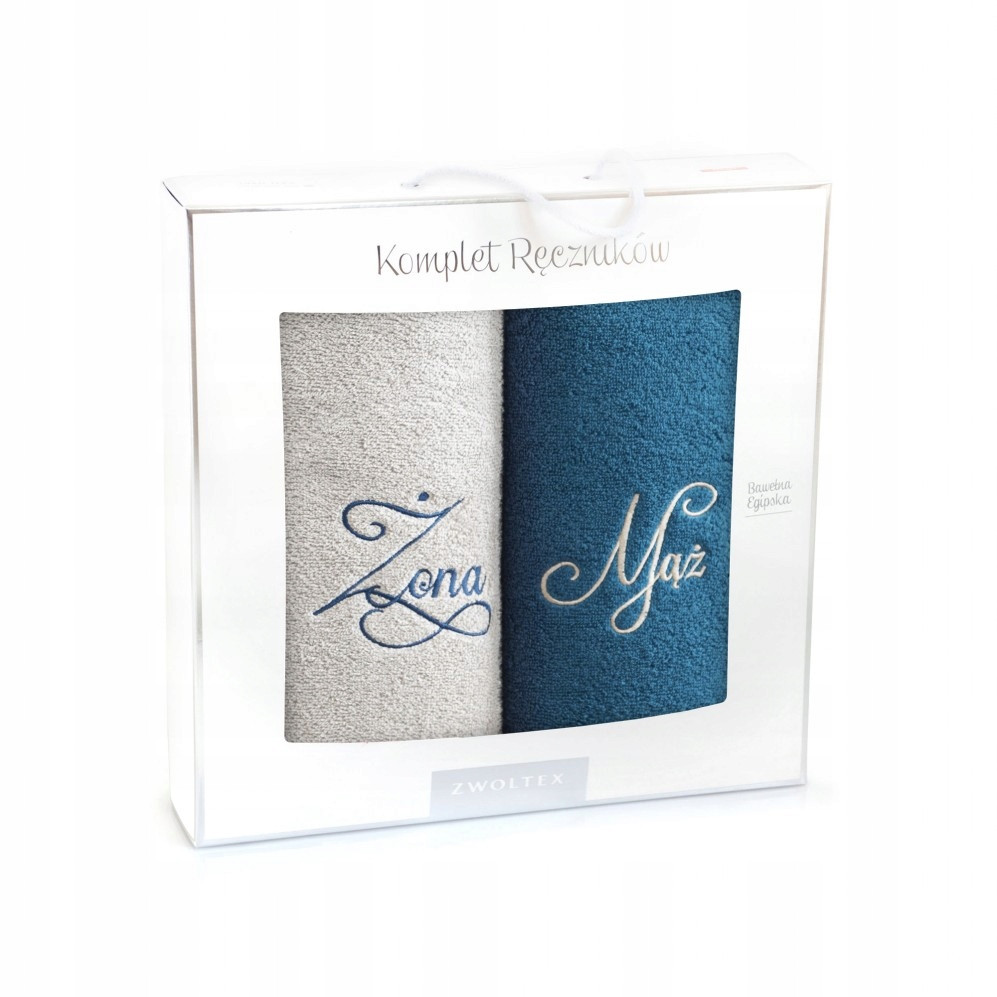 W skład kompletu wchodzi ręcznik w kolorze stalowym i niebieskim. Ozdobione są pięknym haftem w formie napisów: "Mąż", "Żona".