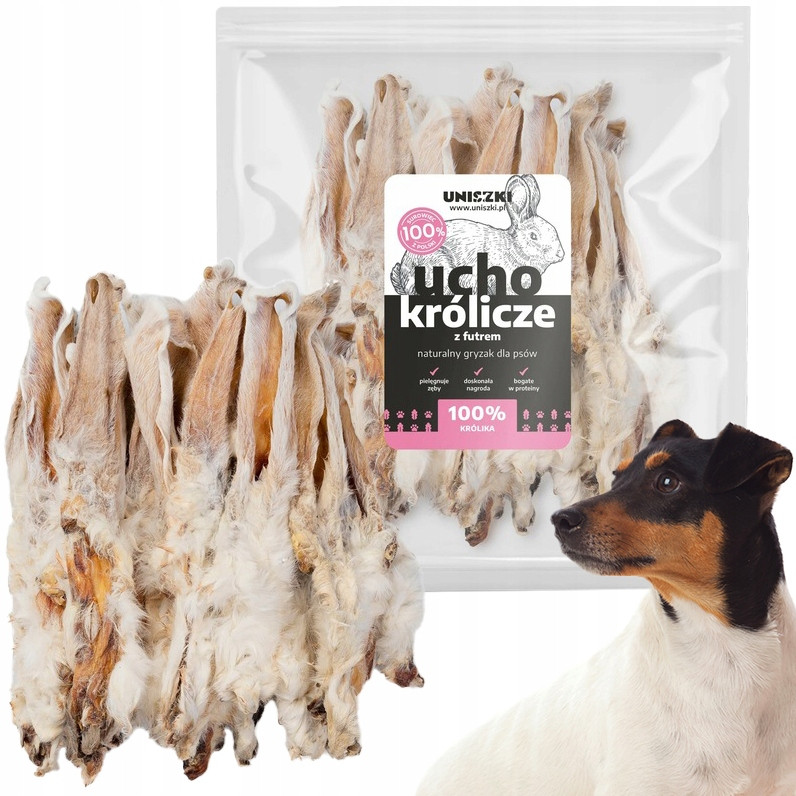 Ucho królika z futrem to doskonały gryzak dla Twojego psa. Jest nie tylko odżywcze, ale także wzmacnia mięśnie żuchwy. Co równie ważne, pomoże Twojemu psu w ukojeniu nerwów, ponieważ jego gryzienie działa relaksująco.