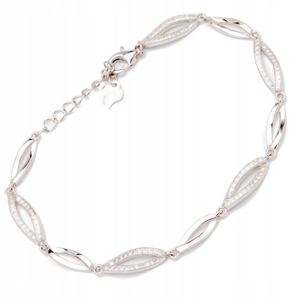 Srebrna bransoletka na rękę z cyrkoniami, damska. Ręcznie wykonana z lśniącego srebra próby 925. Bransoletka ma możliwość regulacji długości.