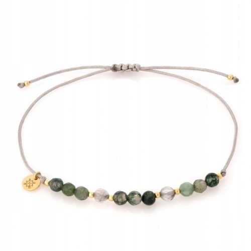 Delikatna bransoletka na szarym sznurku o regulowanej długości. Długość maksymalna bransoletki to 27 cm. Na sznurku fasetowane naturalne kamienie - agat pasiasty zielony o średnicy 4 mm i kwarc szary o średnicy 4 mm oraz złote kuleczki o średnicy 2 mm. Zawieszka sygnowana logotypem Ania Kruk oraz kuleczki wykonane ze srebra próby 925. Materiał podczas użytkowania może ulec przetarciom. Uszkodzenia mechaniczne sznurka nie podlegają reklamacji.