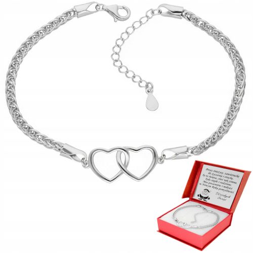 Zachwycaj blaskiem lub przypomnij bliskiej osobie o ważnej dla was chwili dzięki najpiękniejszej biżuterii. Subtelna bransoletka Heart wykonana z najwyższej jakości srebra próby 925 i dodatkowo rodowana. Została ozdobiona zawieszką w kształcie dwóch przeplatających się serc. Ogniwa w łańcuszku pięknie odbijają światło. Celebrytka stanowi wdzięczne uzupełnienie stylizacji i świetlisty akcent podkreślający naturalne piękno kobiety.
