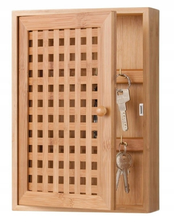 Wykonana z naturalnego bambusa, stylowa szafka do przechowywania kluczy i innych drobiazgów. Sprawdzi się zarówno w przedpokoju, jak i garażu, piwnicy czy innym pomieszczeniu gospodarczym. Pomoże utrzymać porządek. Od teraz Twoje klucze będą zawsze w jednym miejscu pod ręką. Wyposażona w 8 haczyków oraz uchwyt do umocowania na ścianie. Szafka dzięki estetycznemu wykonaniu i stylowym drzwiczkom pięknie wkomponuje się do wnętrz urządzonych w naturalnym stylu.