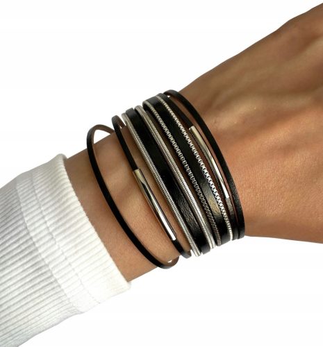 Model dostępny w naszym sklepie posiada bezpieczne, ale i wygodne zapięcie, umożliwiające samodzielne, łatwe zakładanie i ściąganie ozdoby. Ponadto bransoletka zdobiona jest metalowymi elementami w srebrnym kolorze, które rozświetlą stylizację, dodając jej nieco zadziornego szyku.